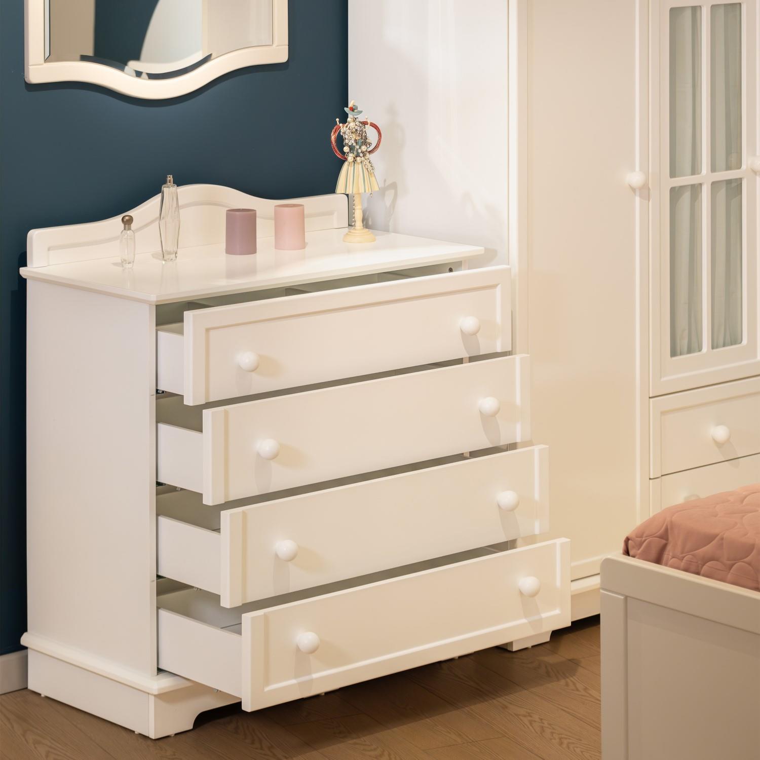 MeltemKids Classy Beyaz Bebek Genç Odası Şifonyer, yüksek kaliteli malzemelerden üretilerek dayanıklılığı ve uzun ömürlü kullanımı garanti eder. 18 mm kalınlığında E1 normunda MDF üzeri lake ve MDF Lam kaplamaya sahiptir, bu sayede sağlam ve estetik bir görünüm sunar.