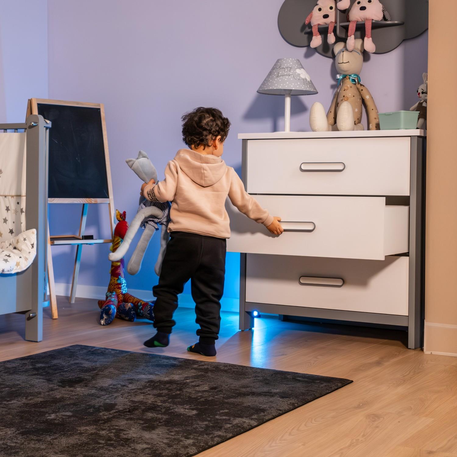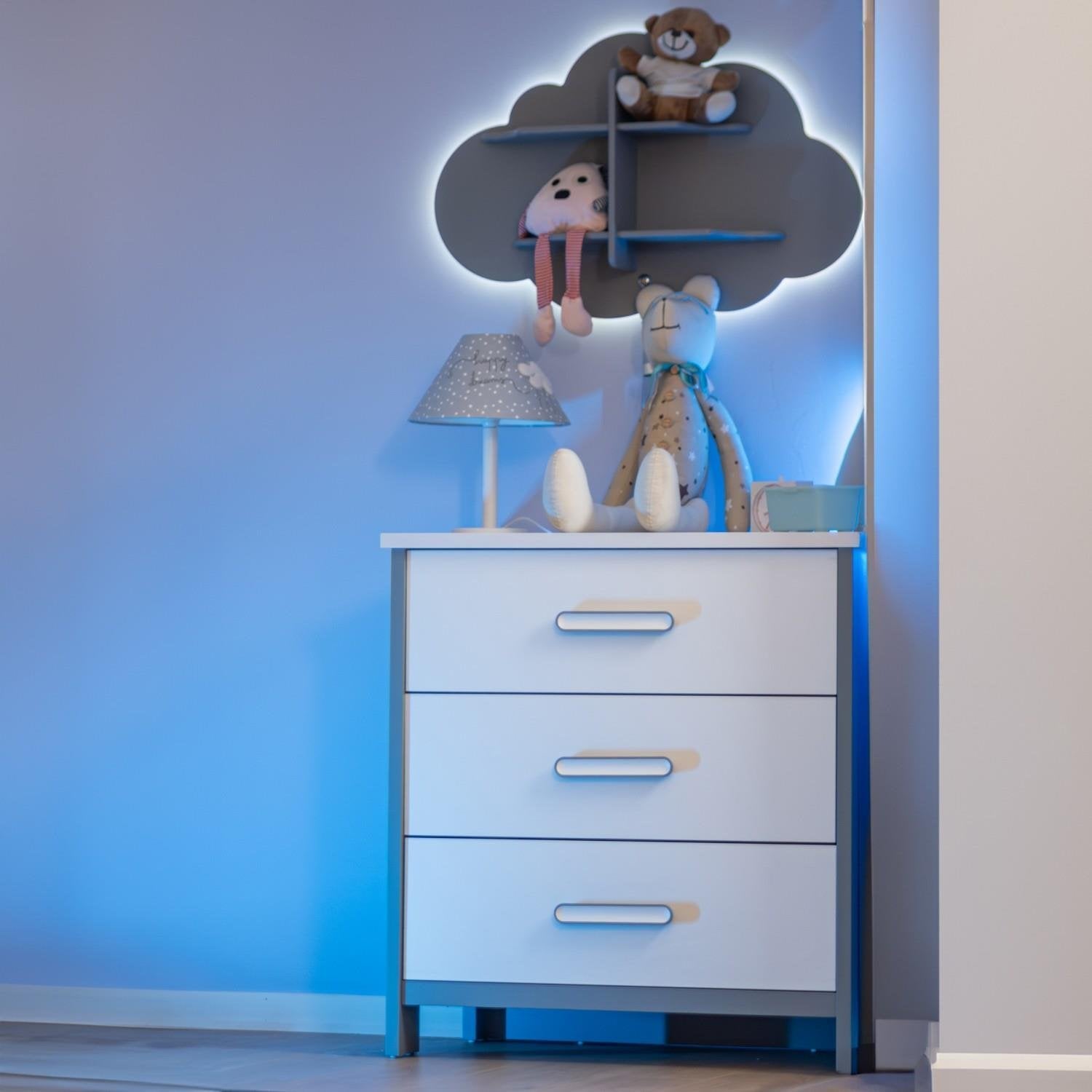 MeltemKids Cozy Gri Çocuk Odası Şifonyer, modern ve fonksiyonel tasarımıyla çocuk odalarına estetik ve düzen getiriyor. 18 mm kalınlığında E1 normunda MDF üzeri lake ve MDF Lam kaplamasıyla dayanıklı bir yapıya sahiptir.