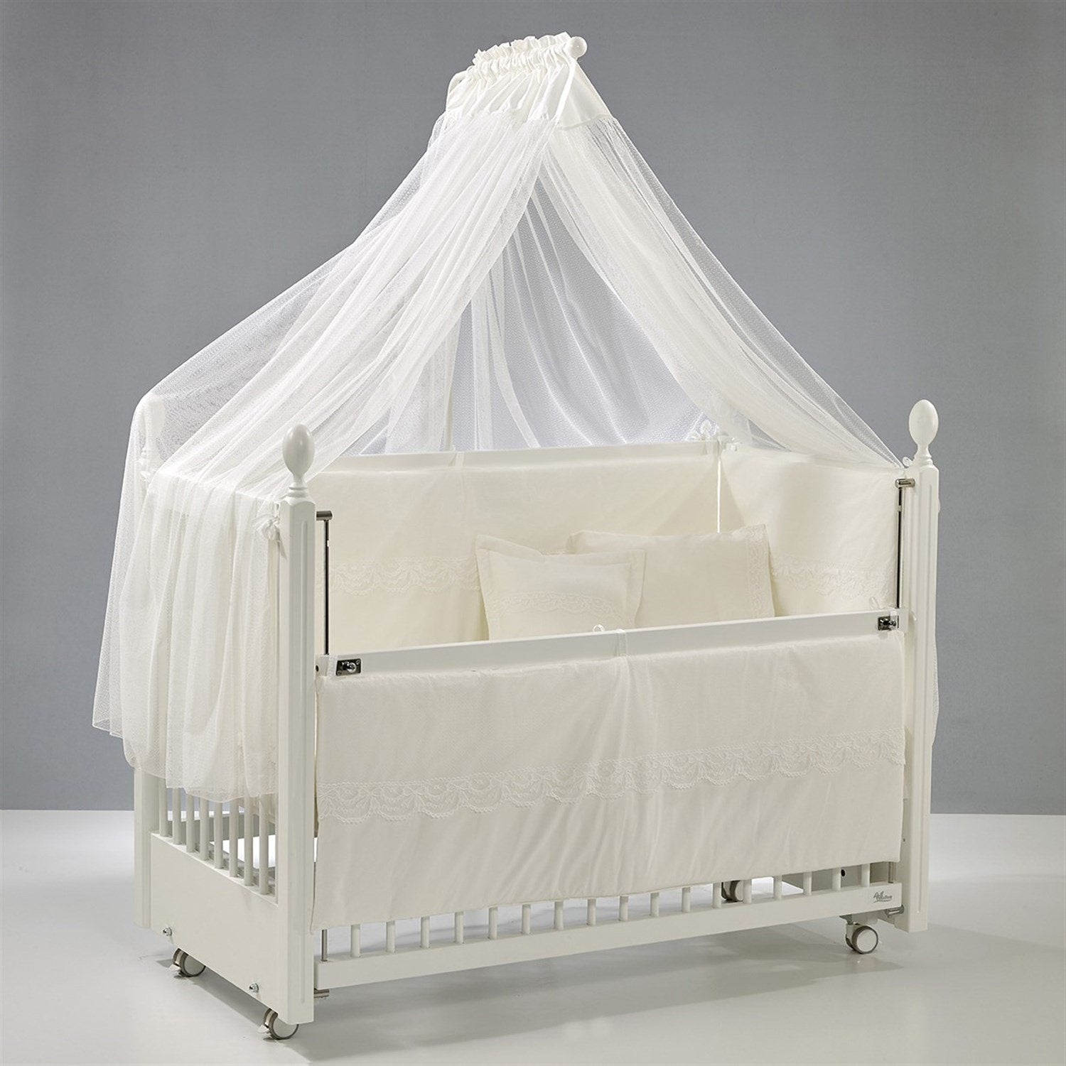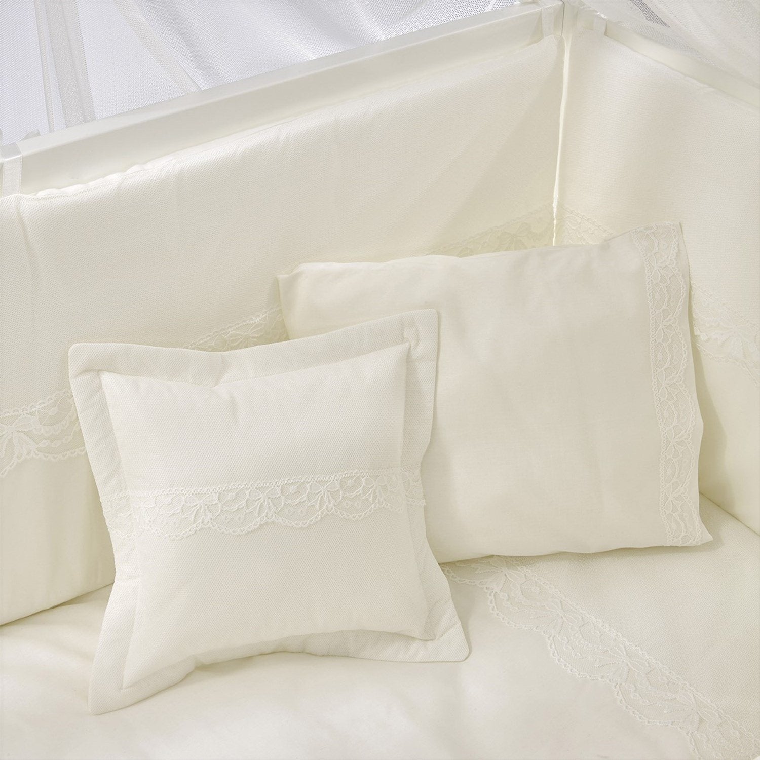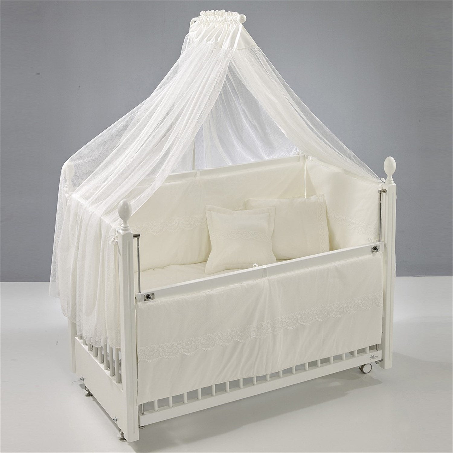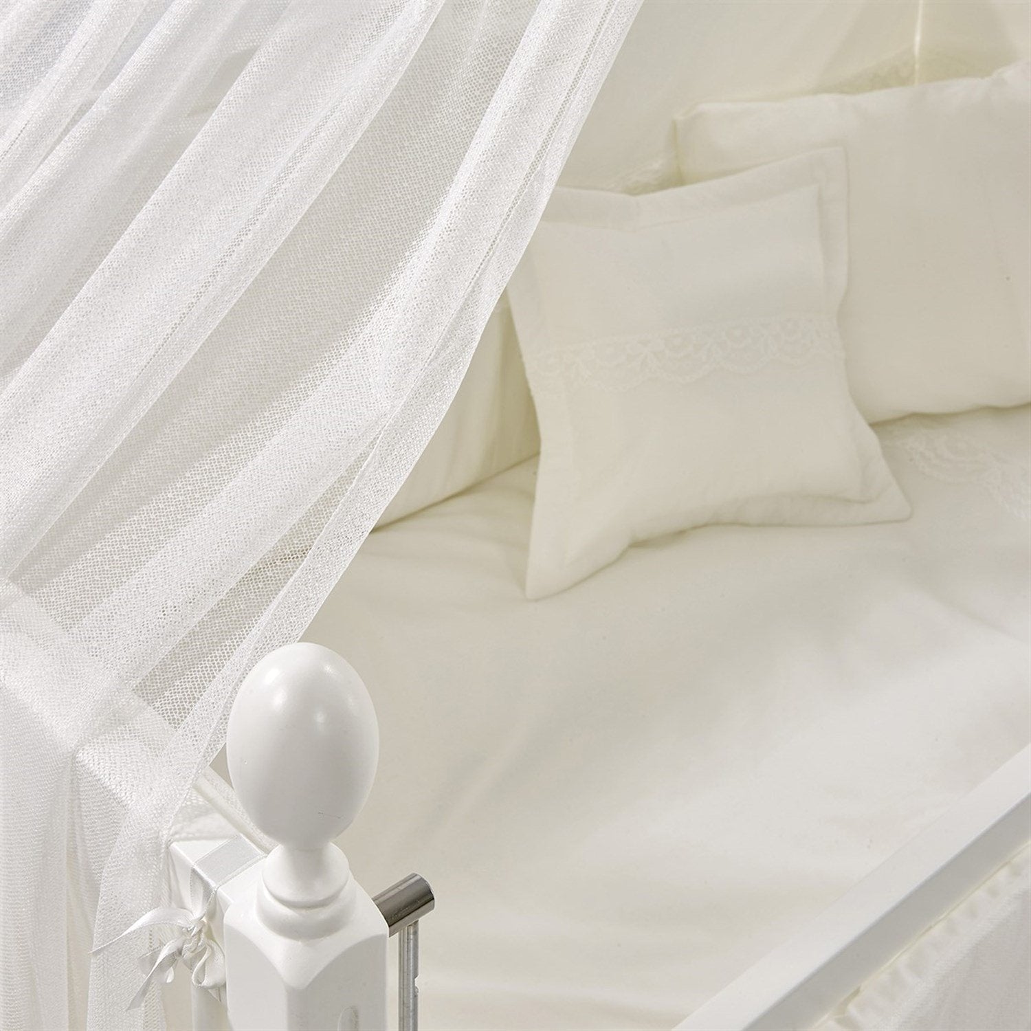 Beyaz MDF Beşik + Yatak + Krem Uyku Seti + Cibinlik Seti