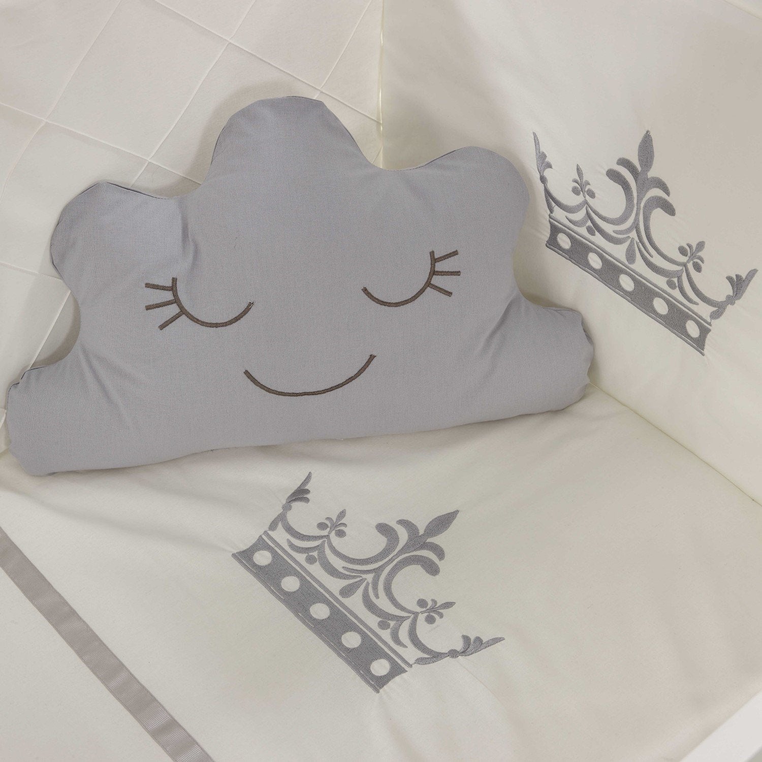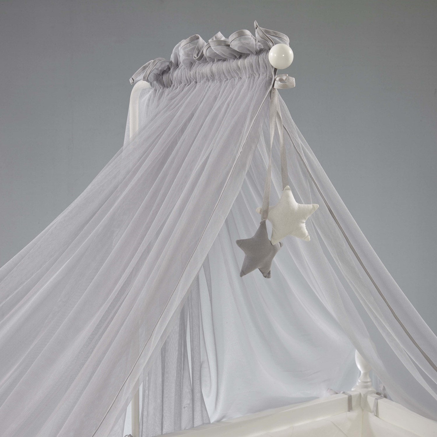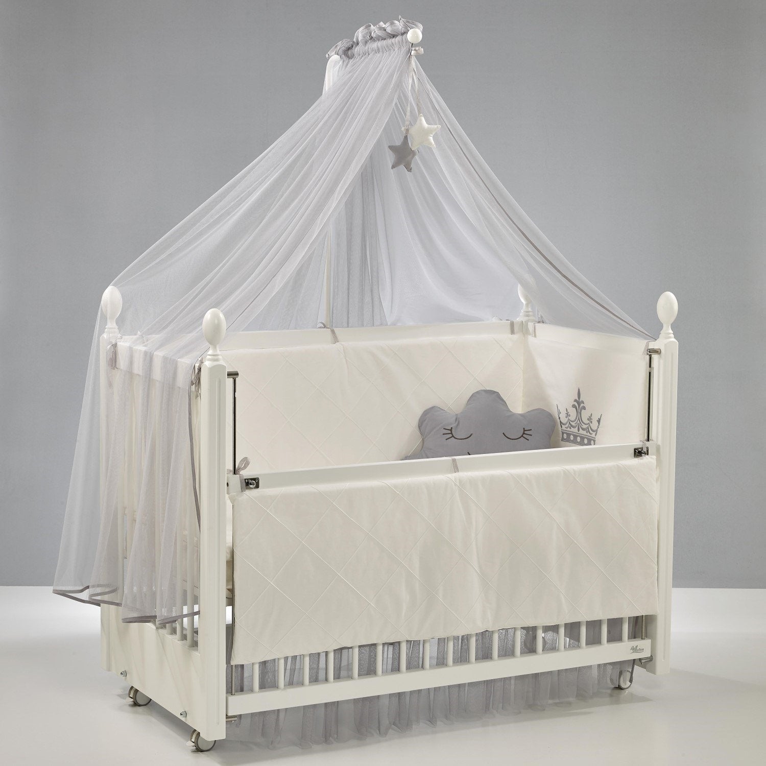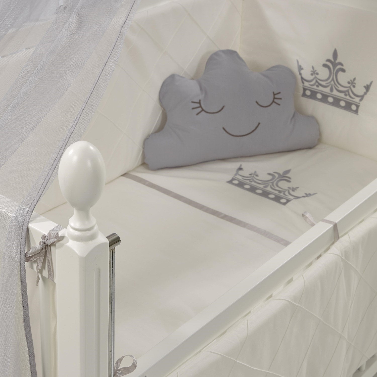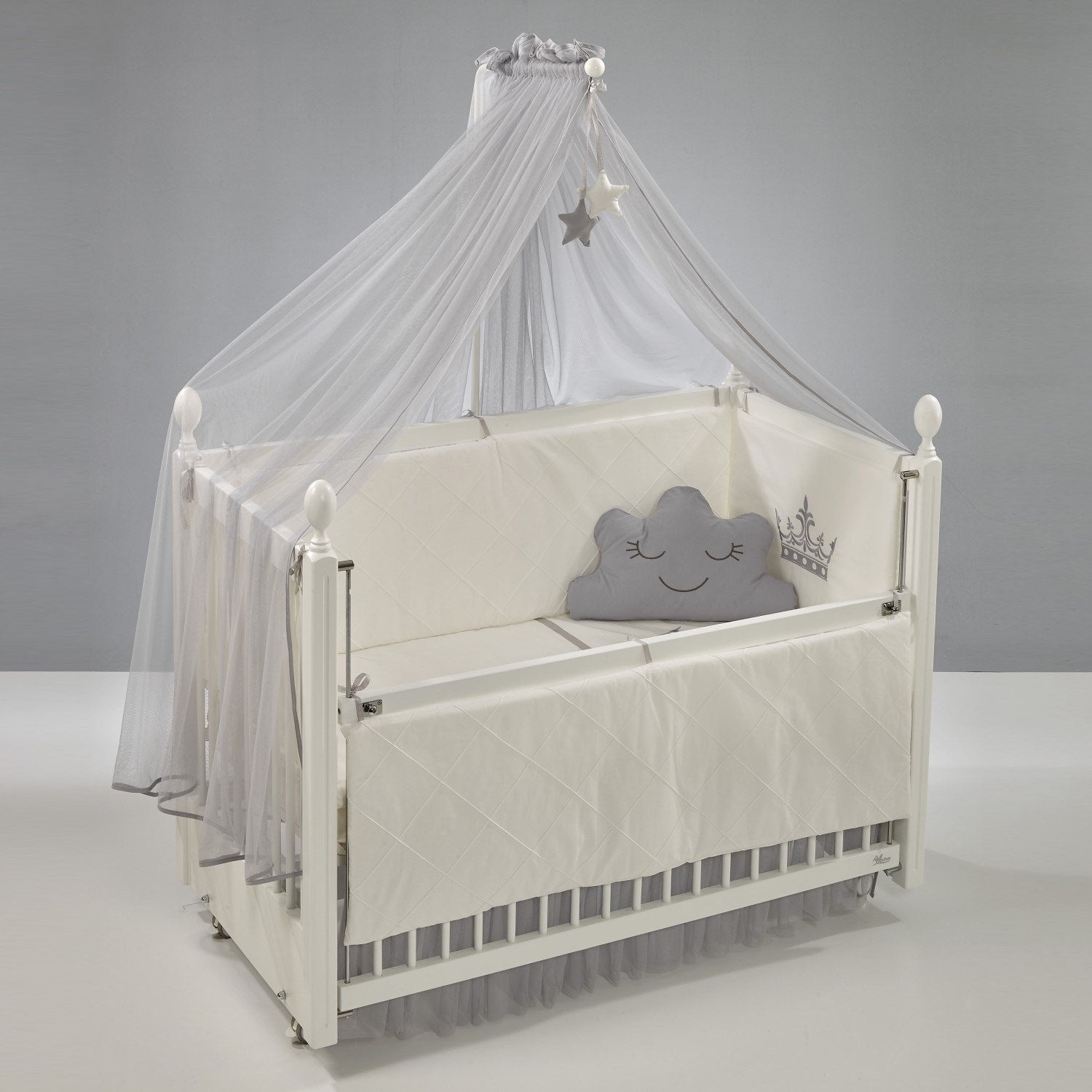Beyaz MDF Beşik + Yatak + Motto Gri Nakışlı Uyku Seti + Cibinlik Seti