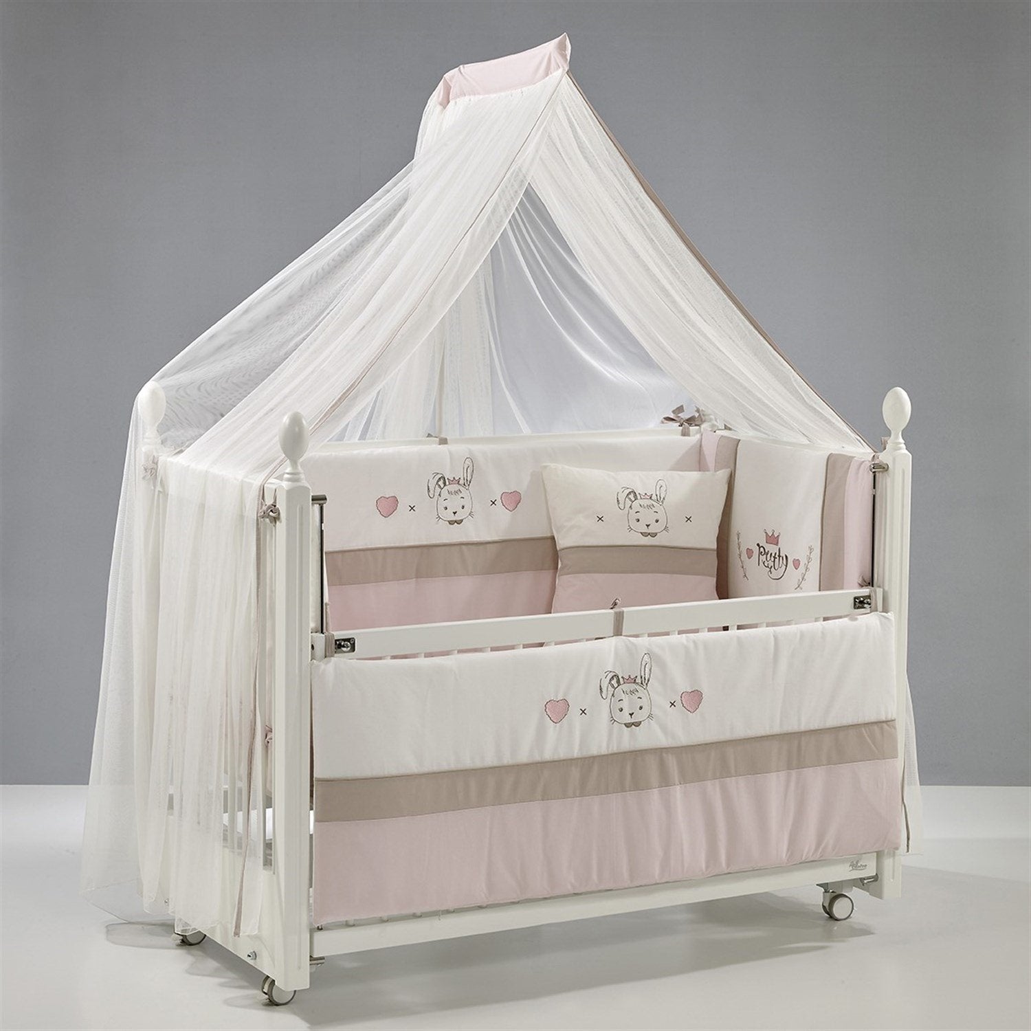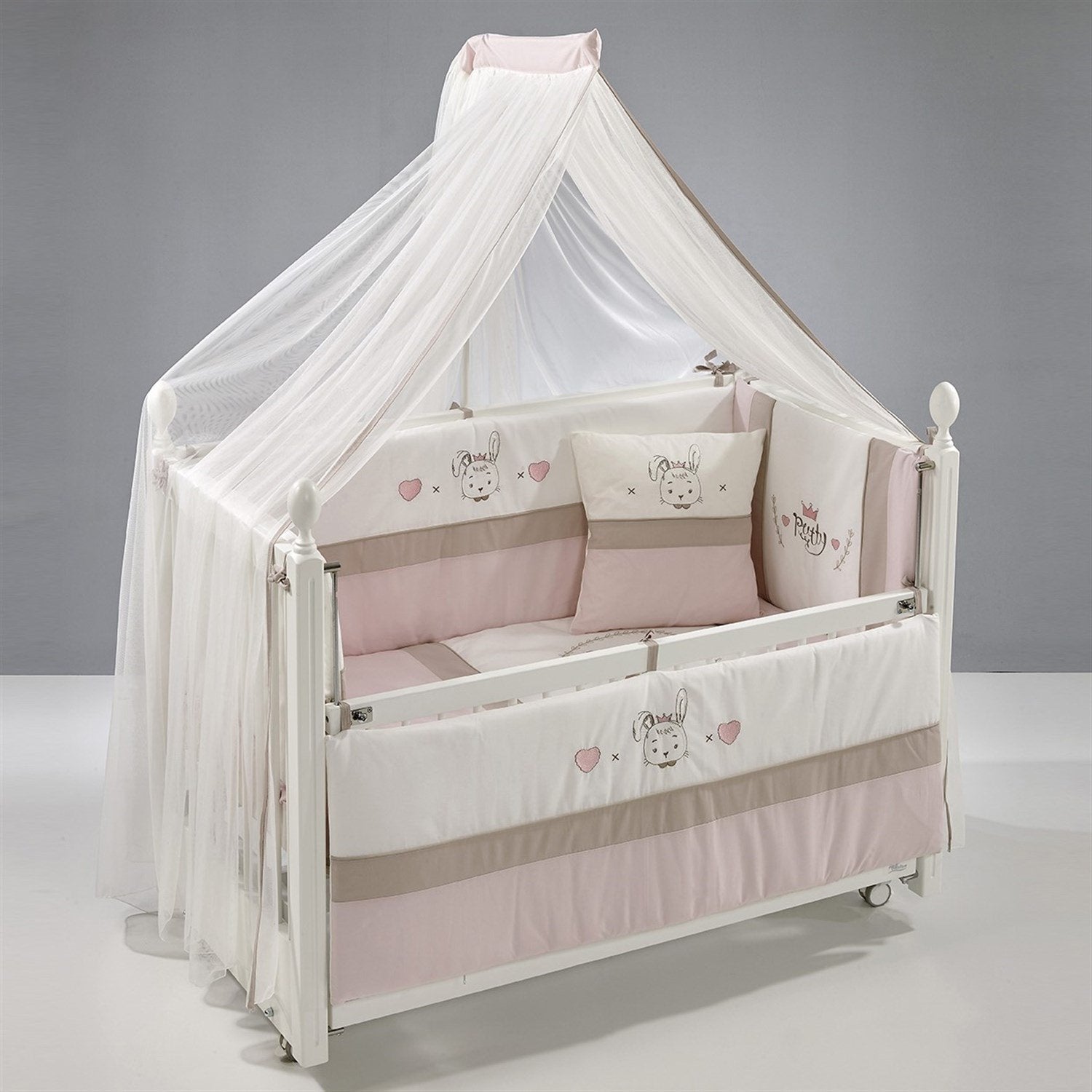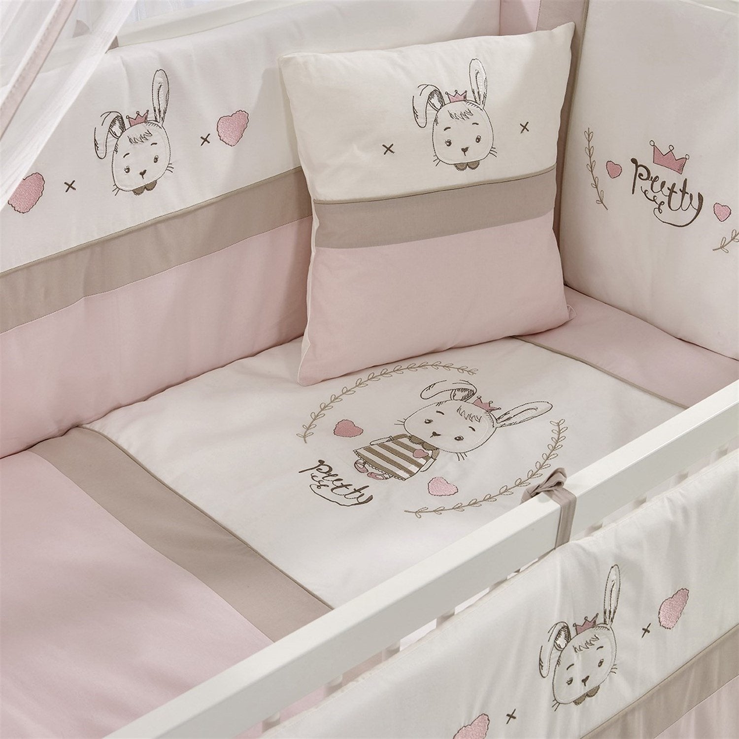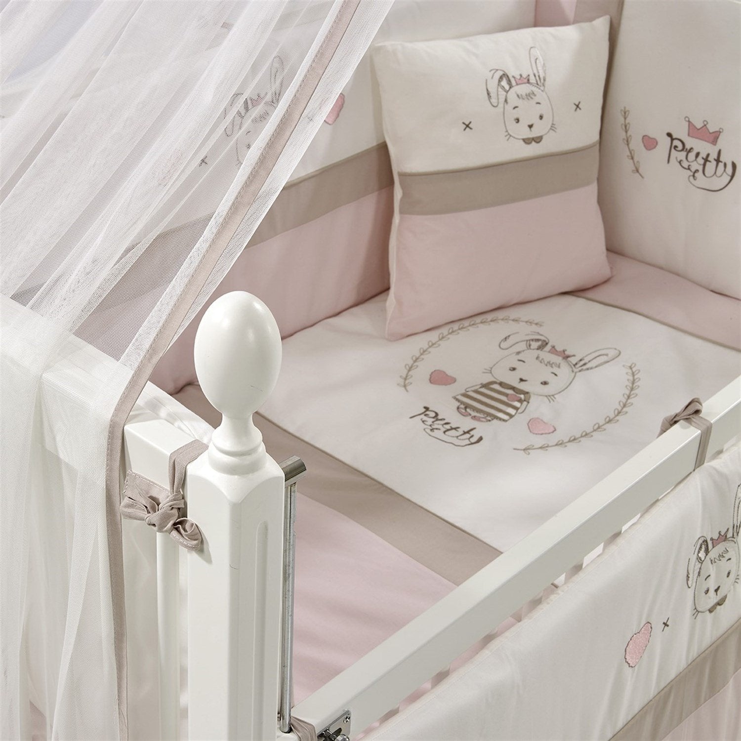 Beyaz MDF Beşik + Yatak + Pretty Nakışlı Uyku Seti + Cibinlik Seti