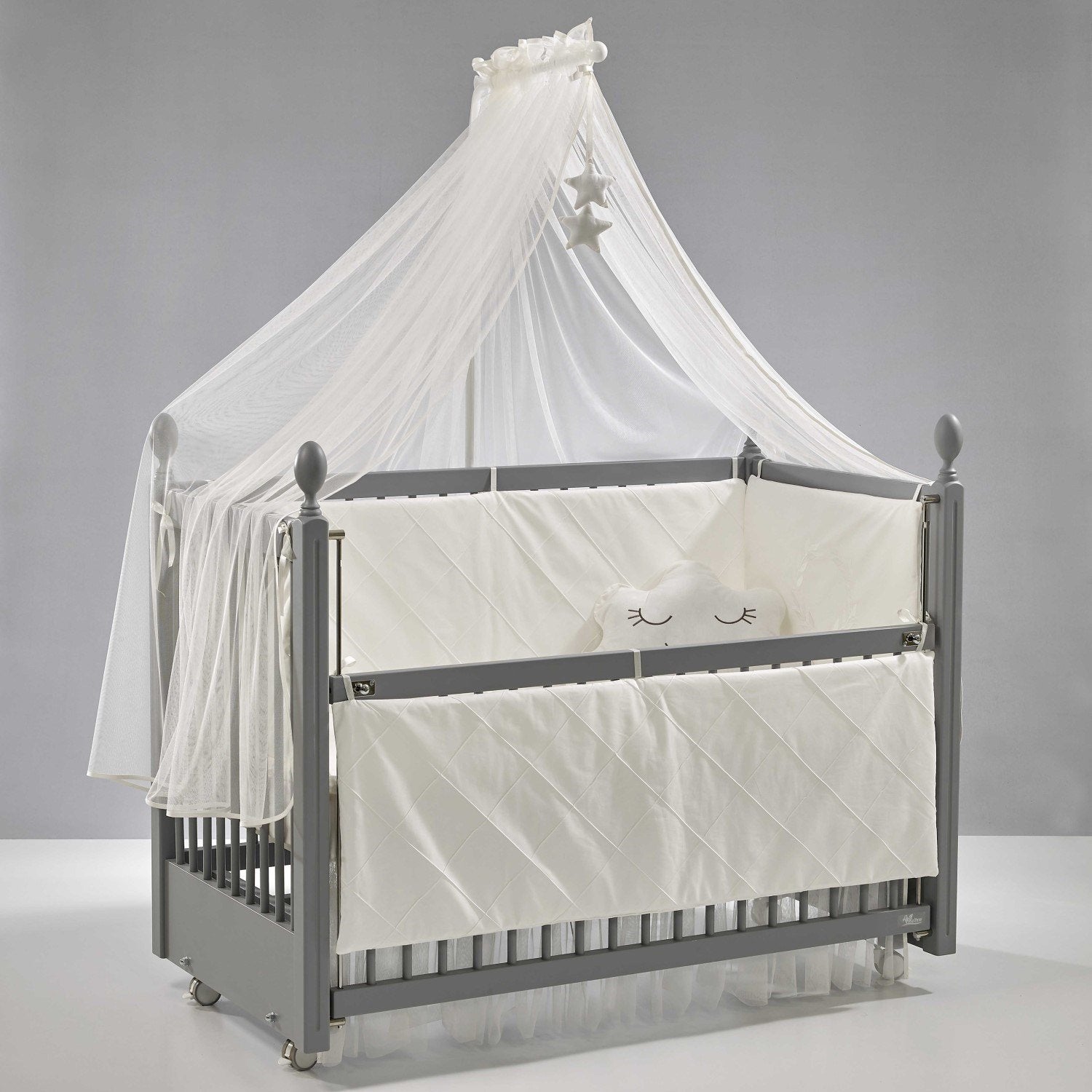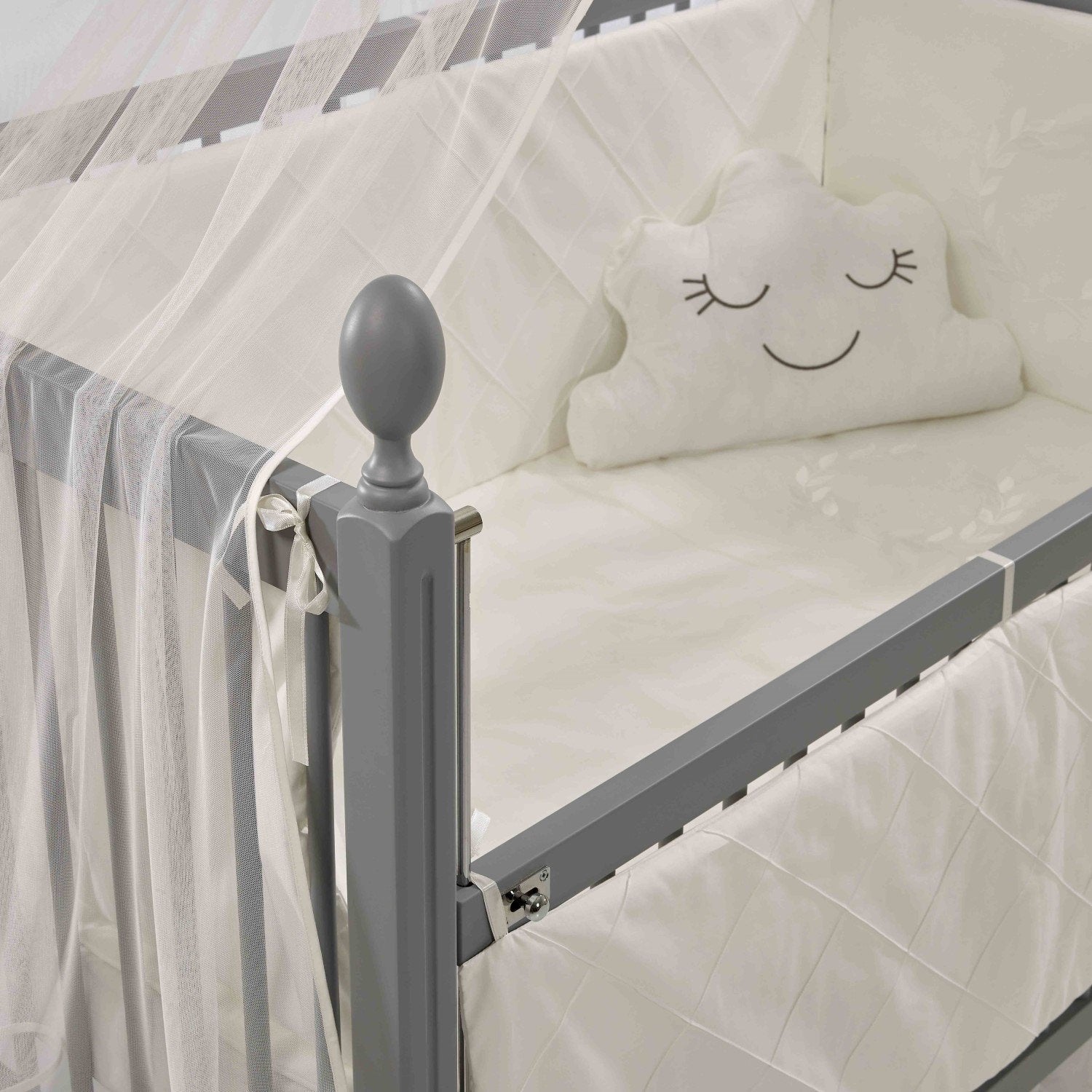 Gri MDF Beşik + Yatak + Motto Ekru Nakışlı Uyku Seti + Cibinlik Seti