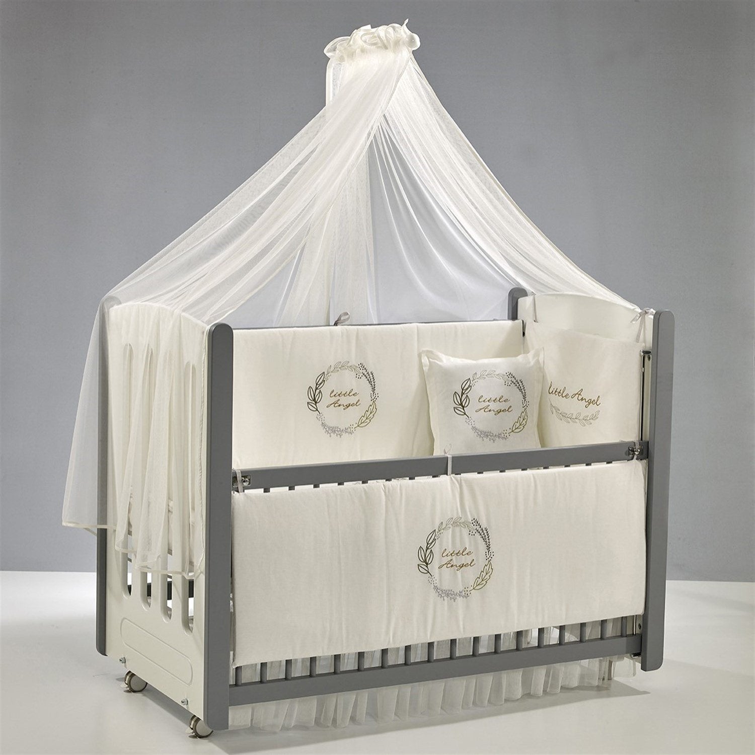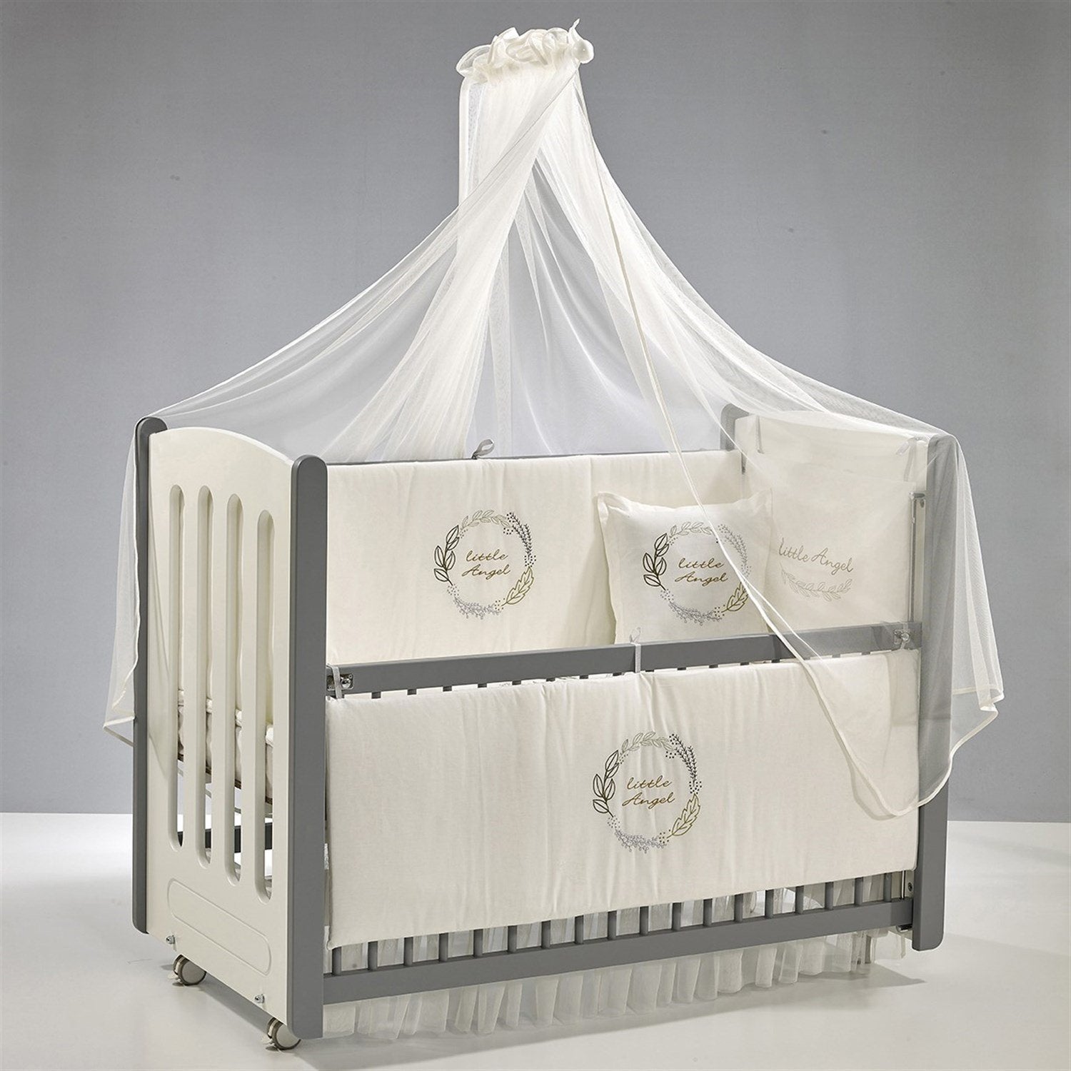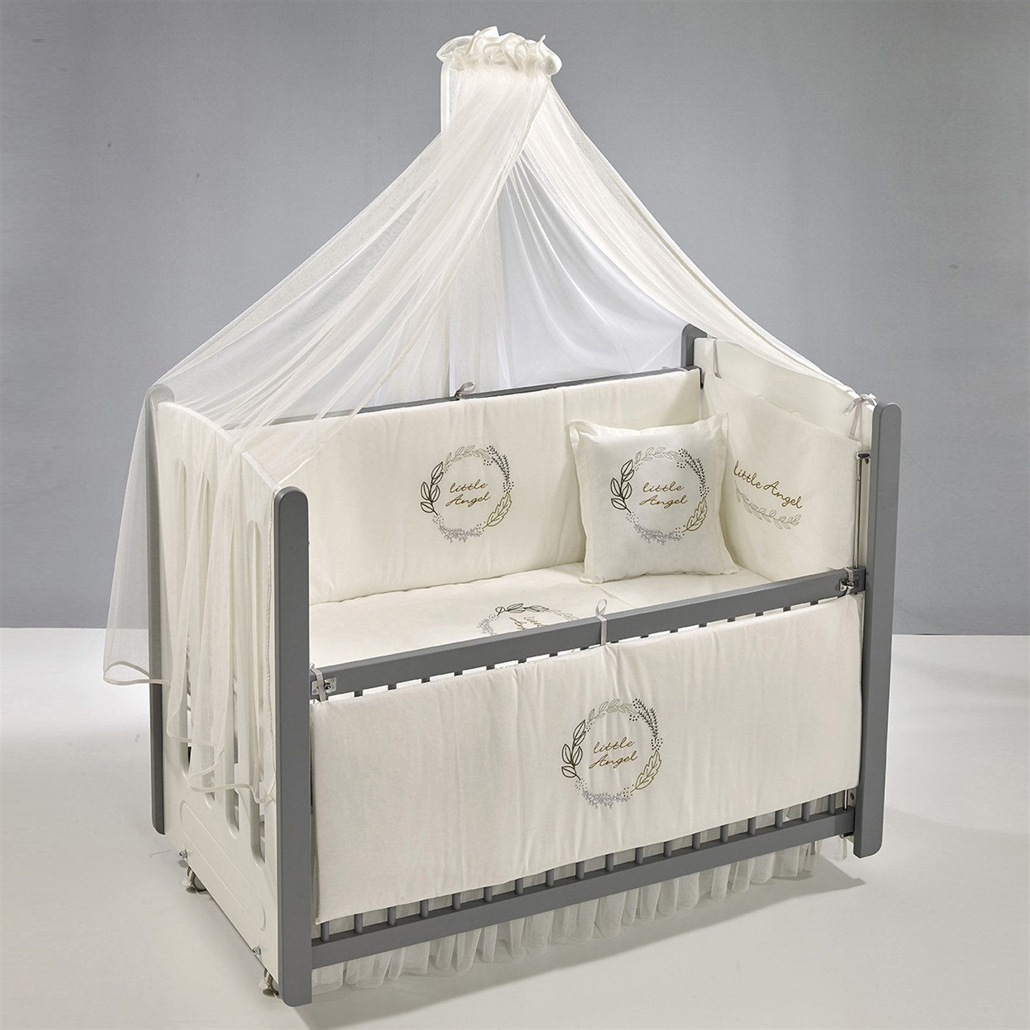 Gri-Beyaz MDF Beşik + Yatak + Angel Nakışlı Uyku Seti + Cibinlik Seti