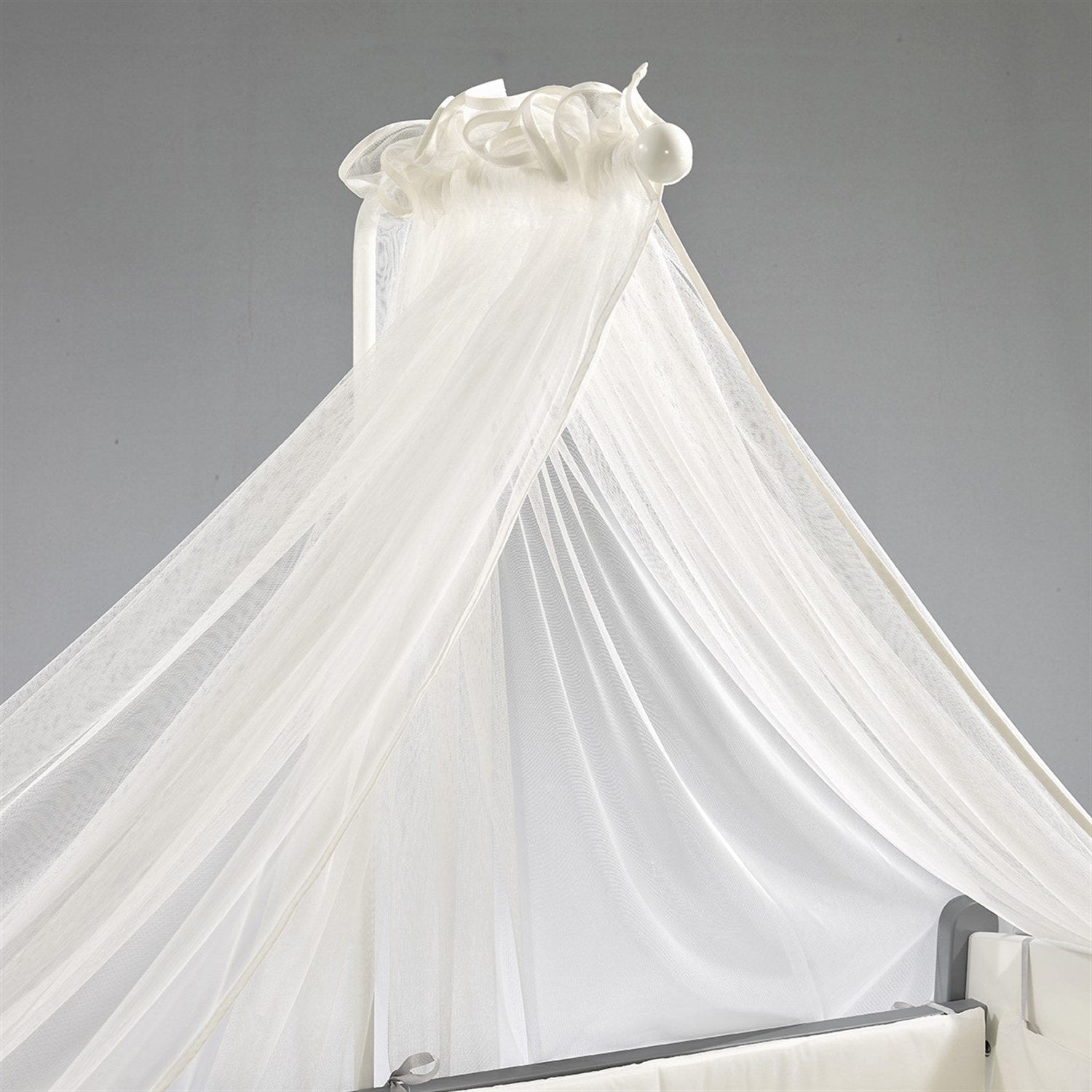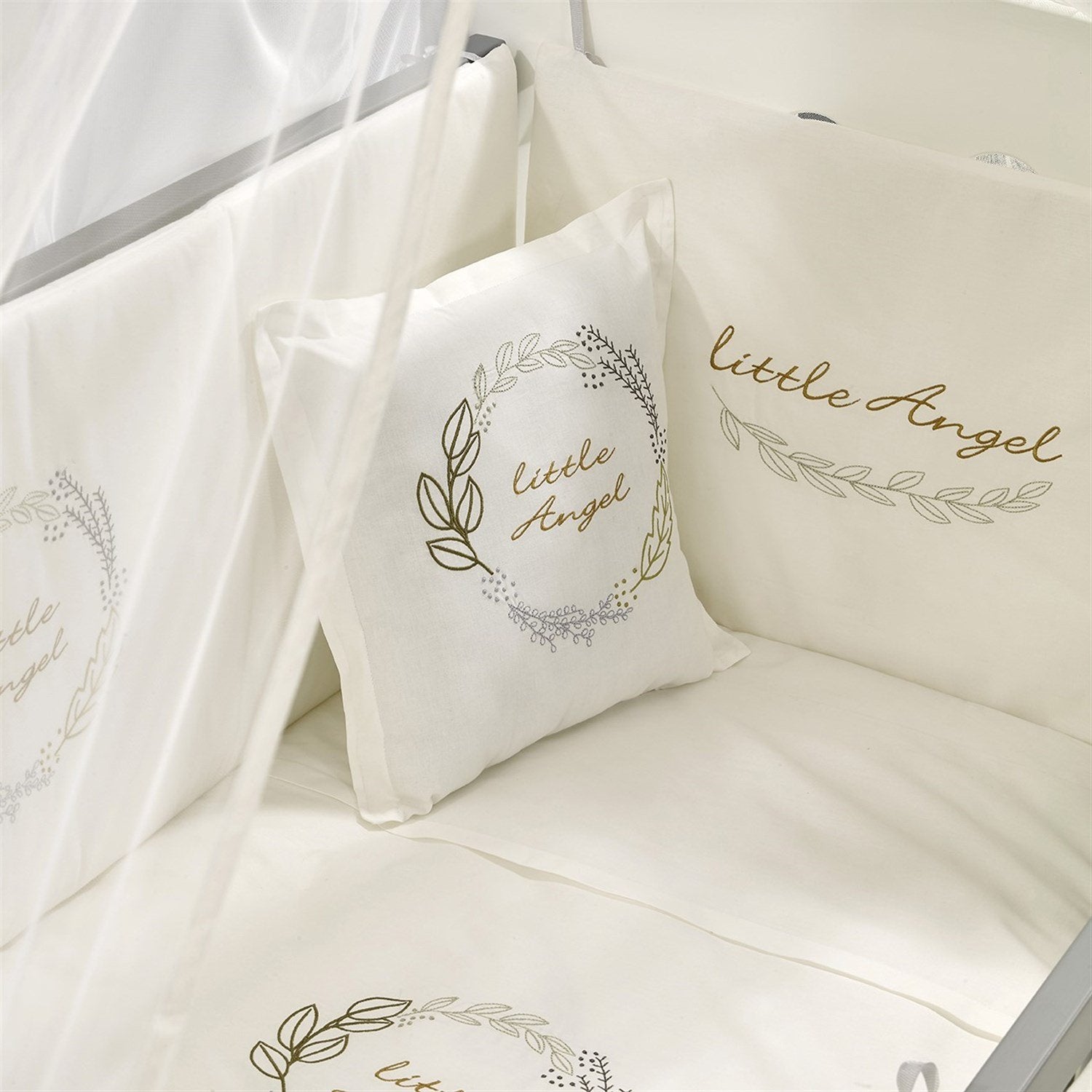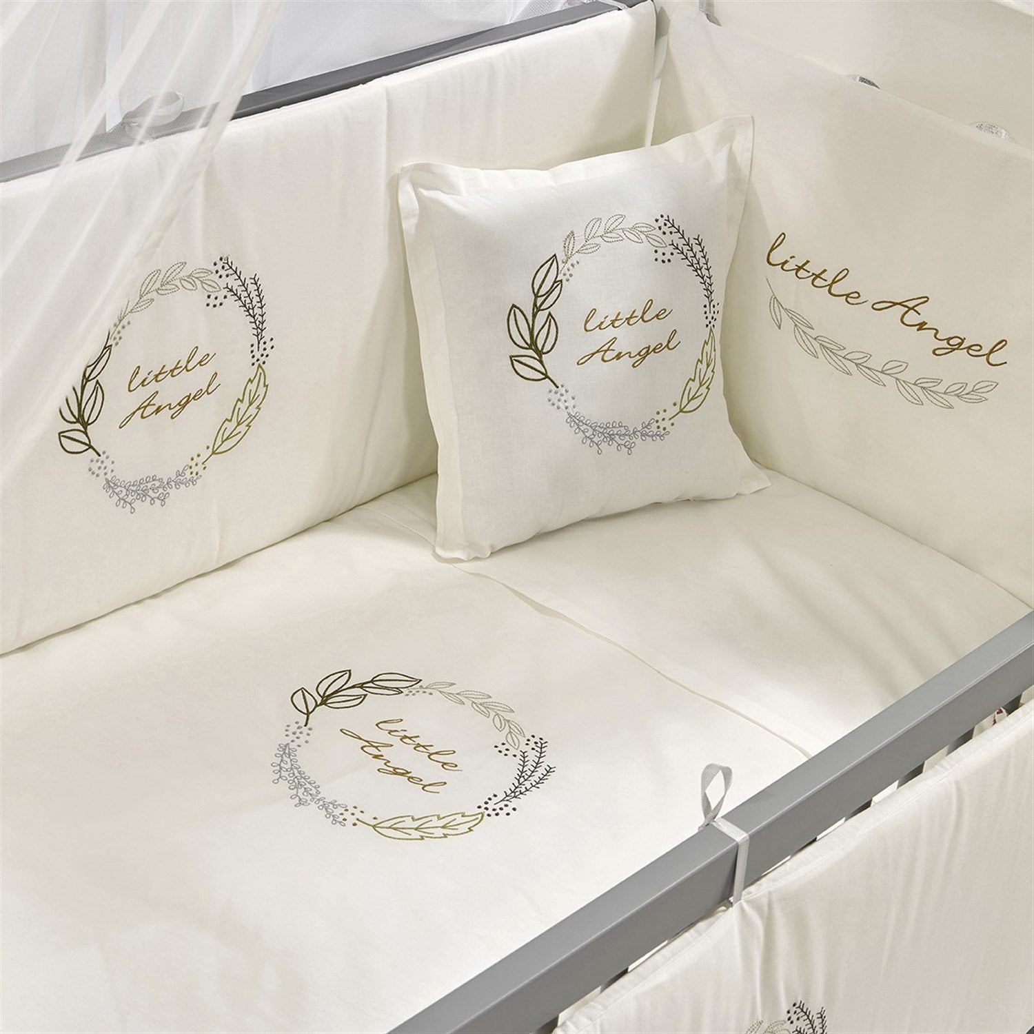 Gri-Beyaz MDF Beşik + Yatak + Angel Nakışlı Uyku Seti + Cibinlik Seti