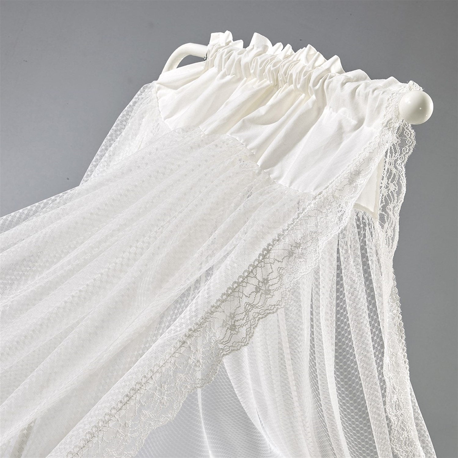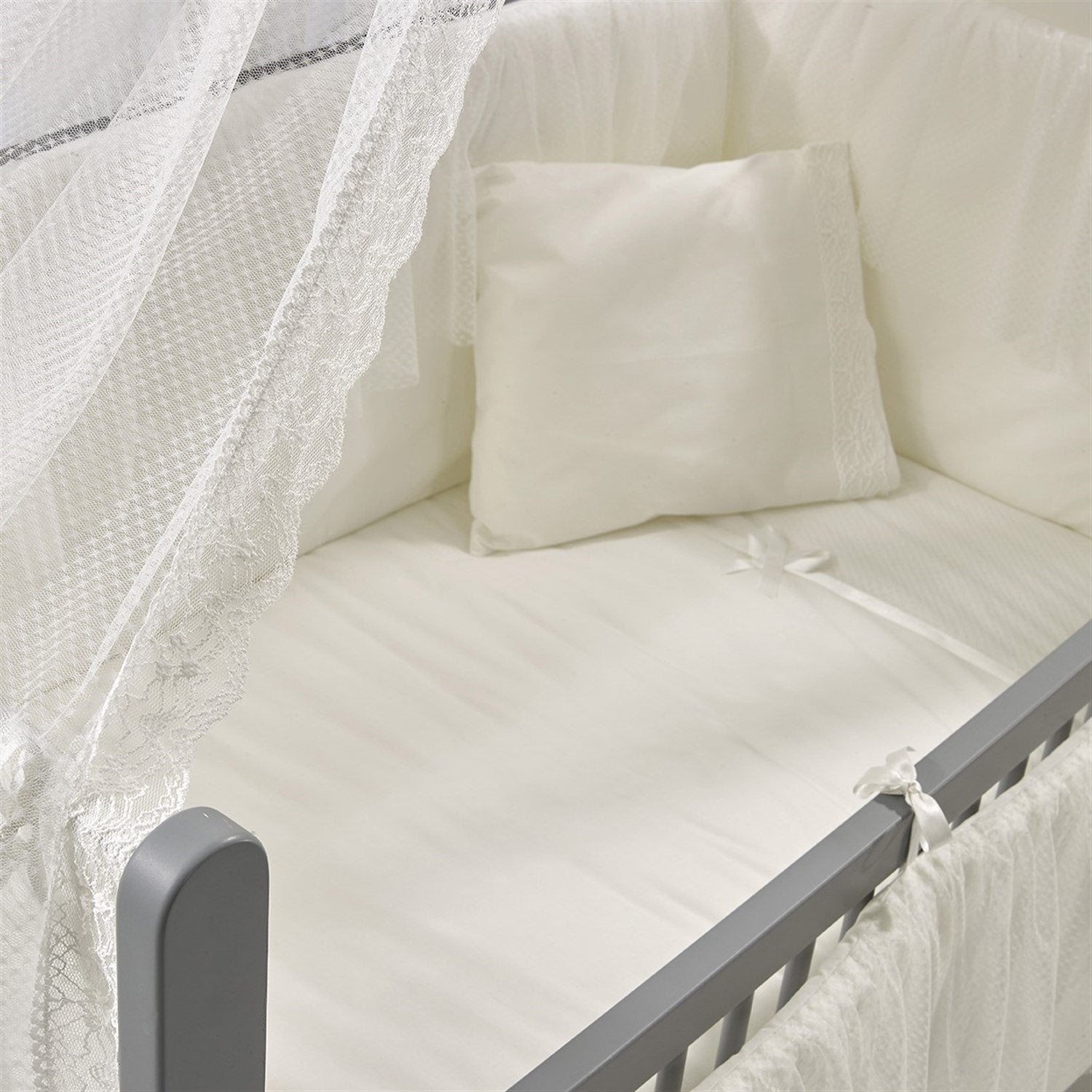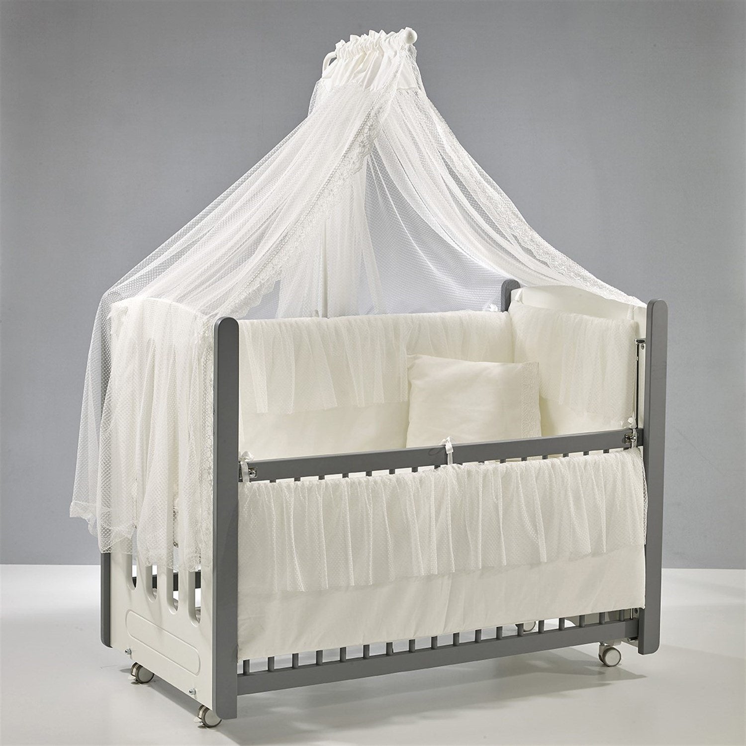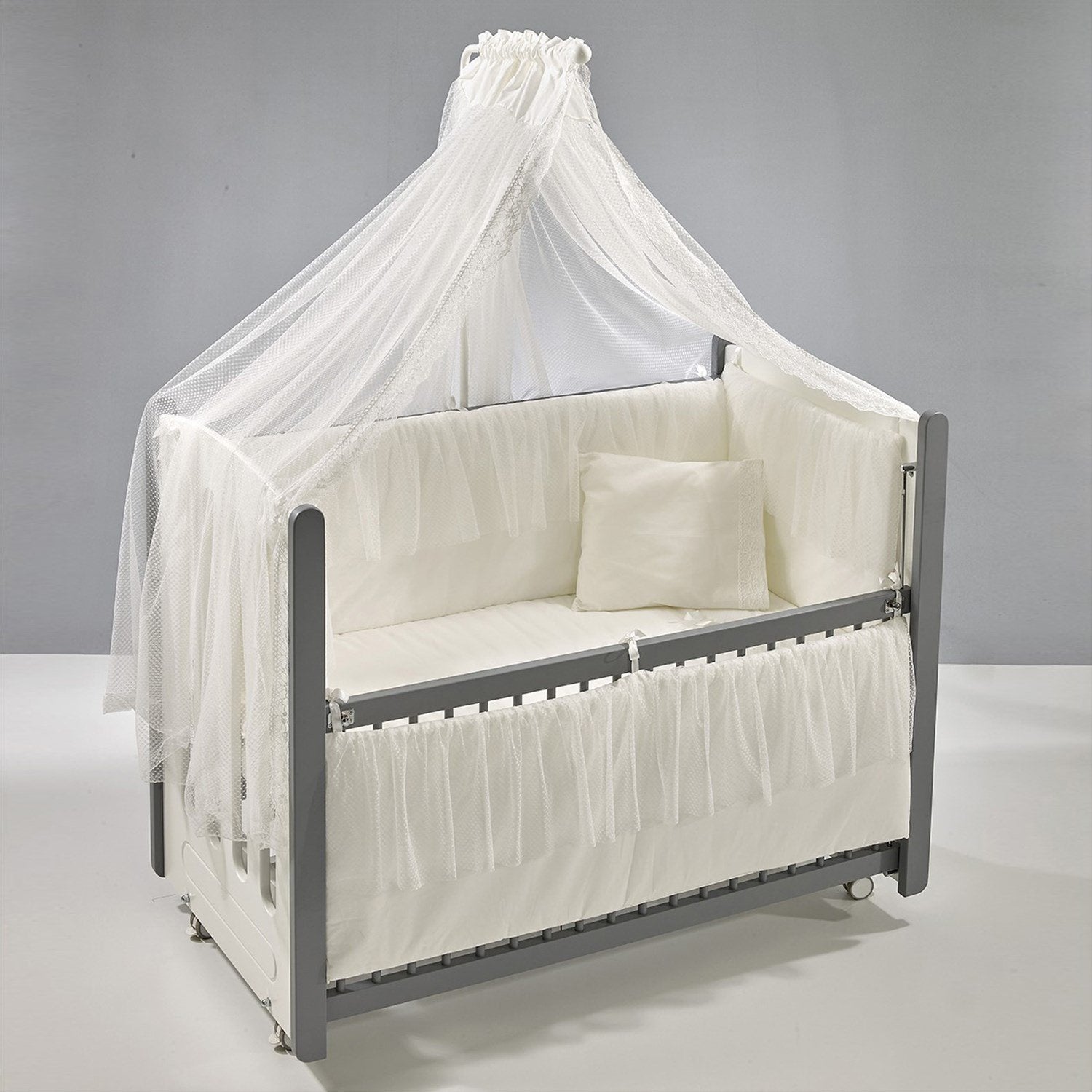 Gri-Beyaz MDF Beşik + Yatak + Ekru Uyku Seti + Cibinlik Seti