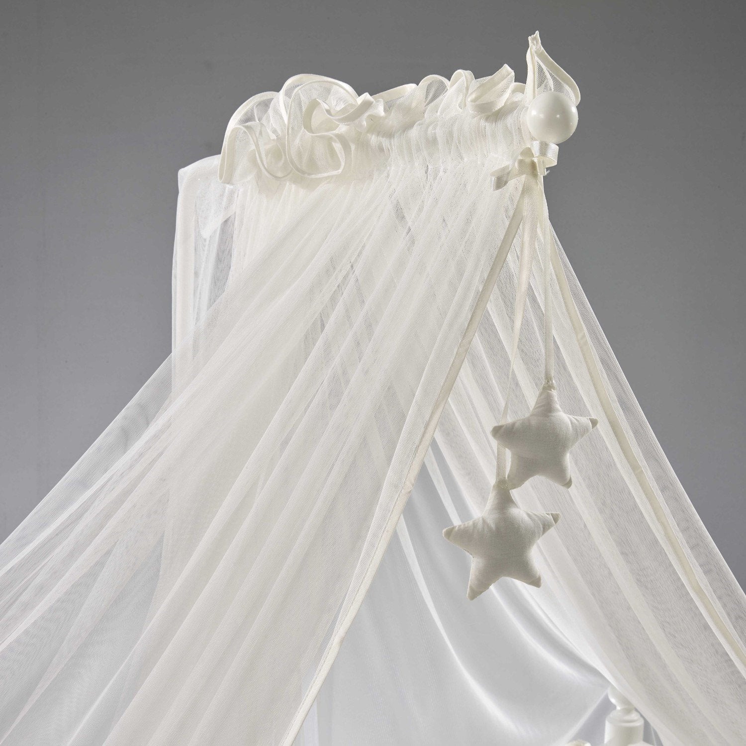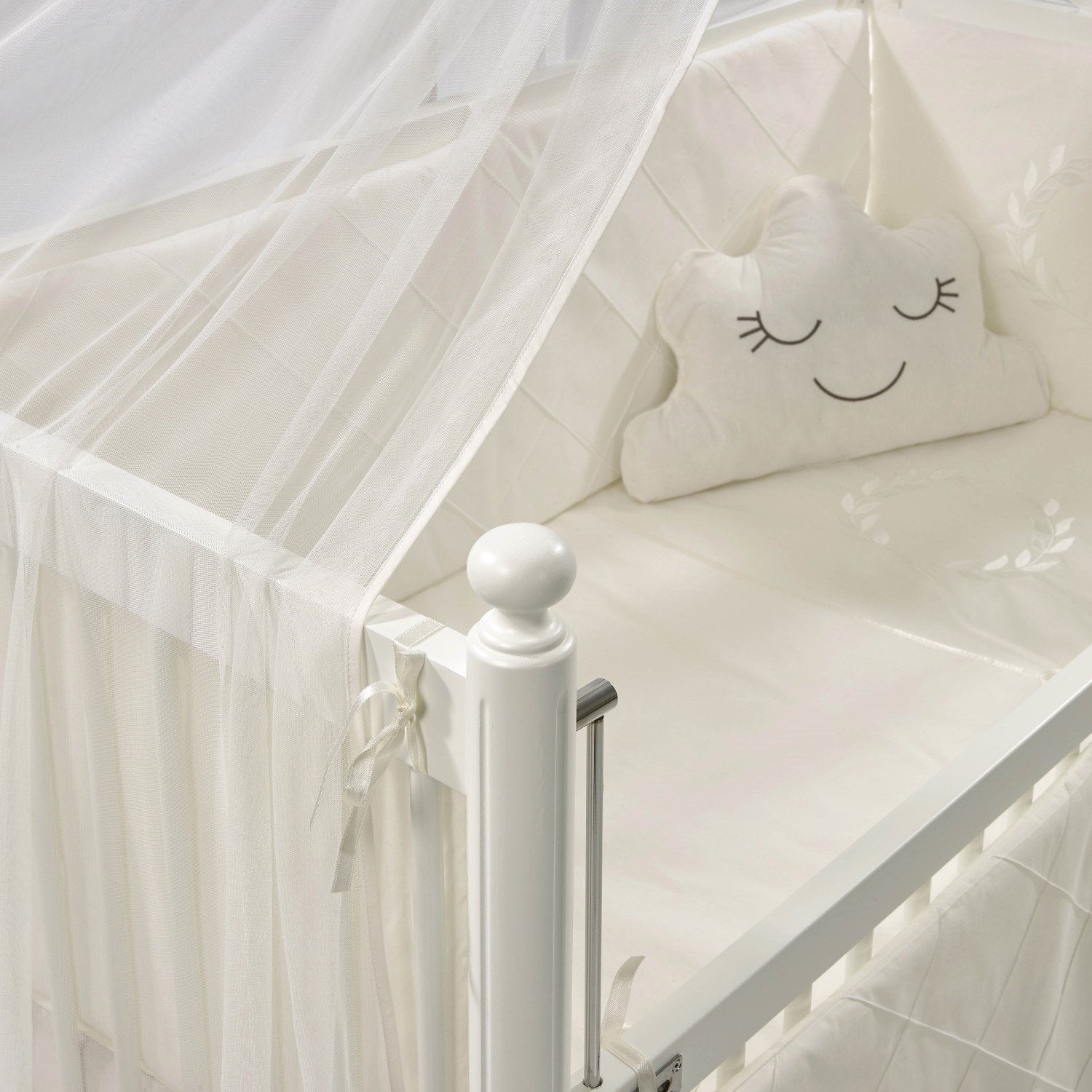Beyaz MDF Beşik + Yatak + Motto Ekru Nakışlı Uyku Seti + Cibinlik Seti