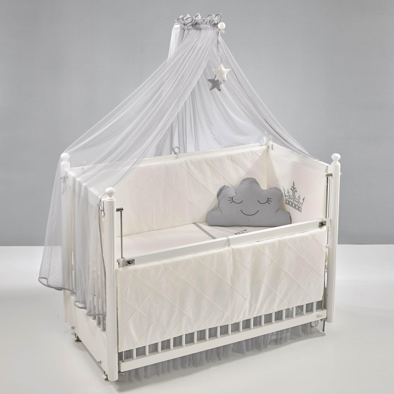 * Set içeriği 9 parçadan oluşmaktadır: 1 adet yorgan, 1 adet çarşaf, 1 adet bulut yastık, 2 adet fermuarlı kısa kenar koruma, 2 adet fermuarlı uzun kenar koruma, 1 adet cibinlik, 1 adet cibinlik aparatı