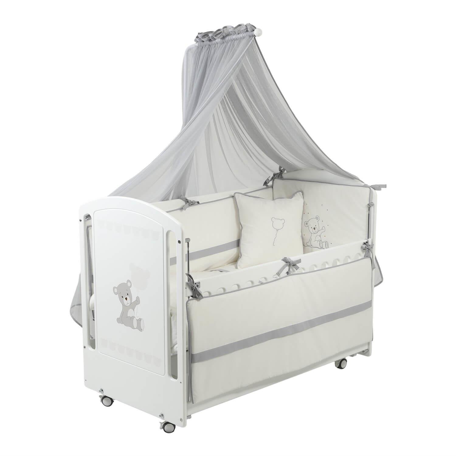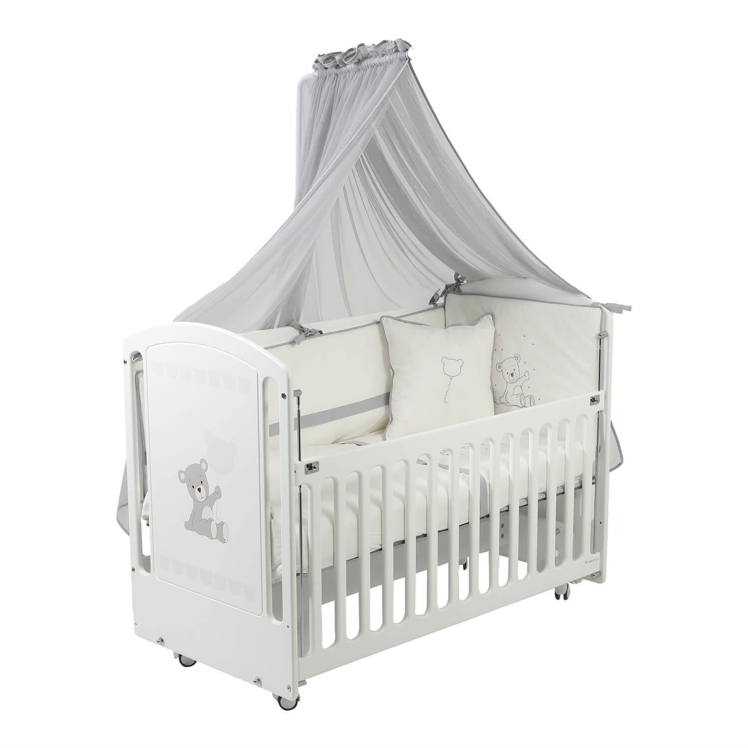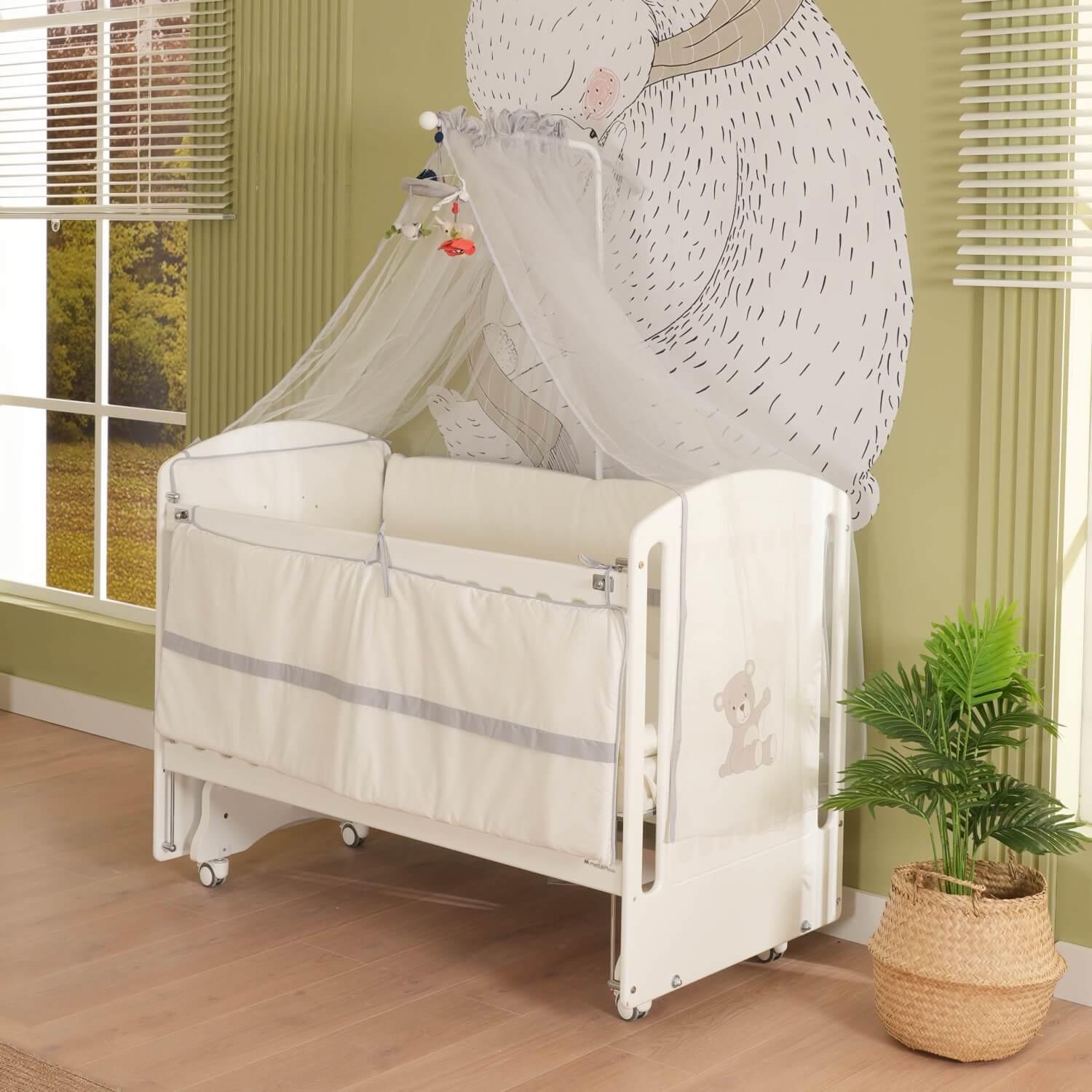 Beyaz MDF Beşik + Yatak + Bear Nakışlı Uyku Seti + Cibinlik Seti