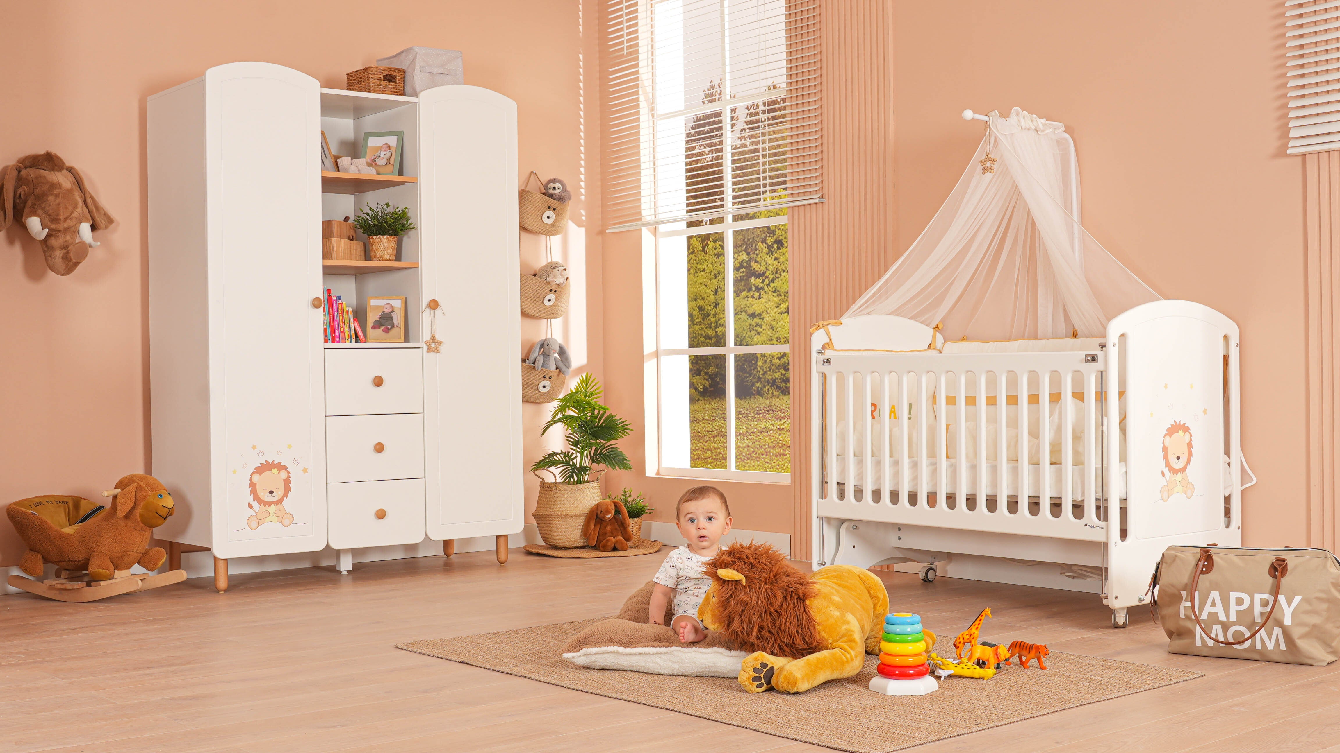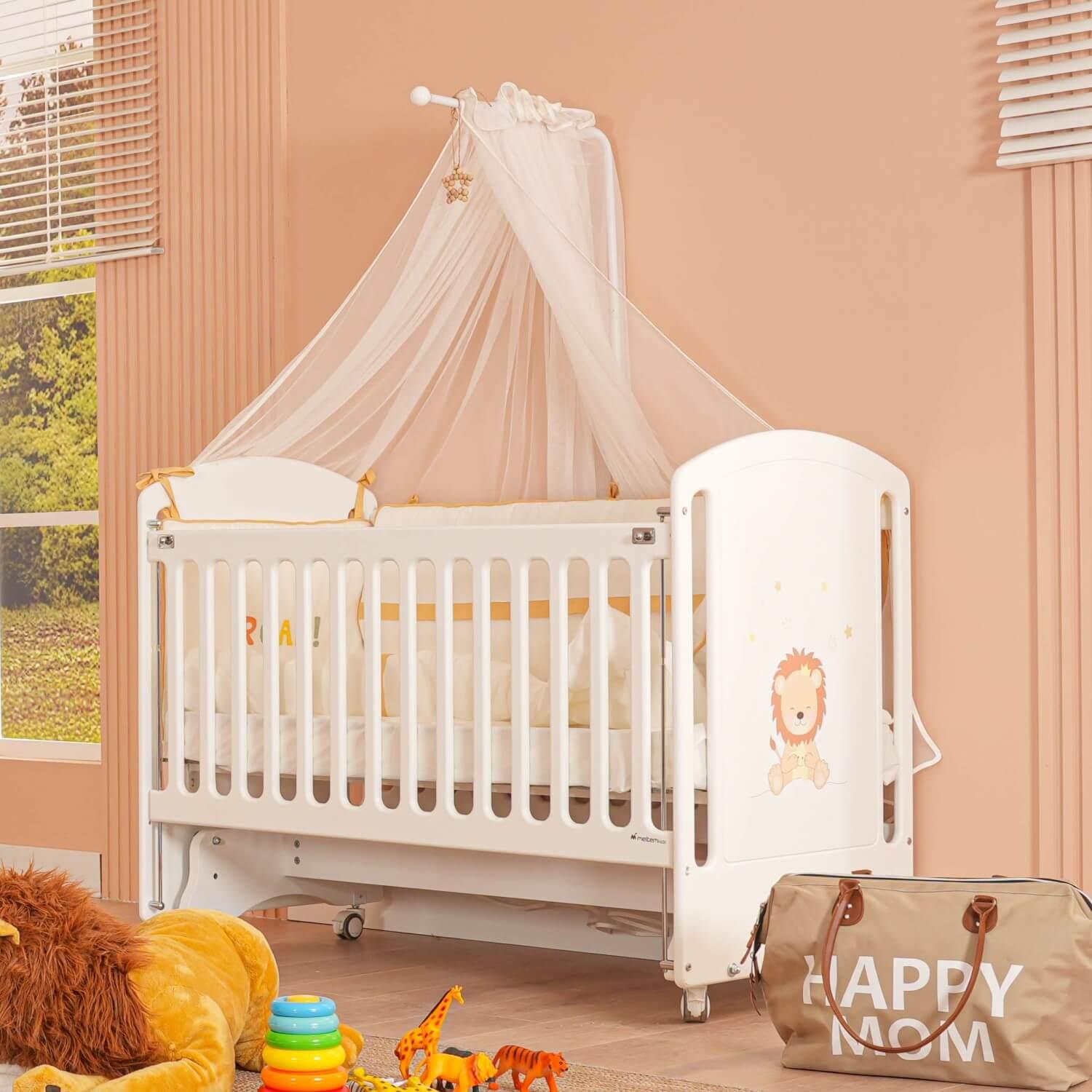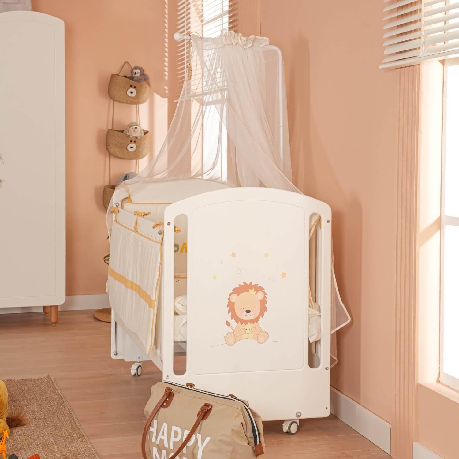 Beyaz MDF Beşik + Yatak + Lion Nakışlı Uyku Seti + Cibinlik Seti