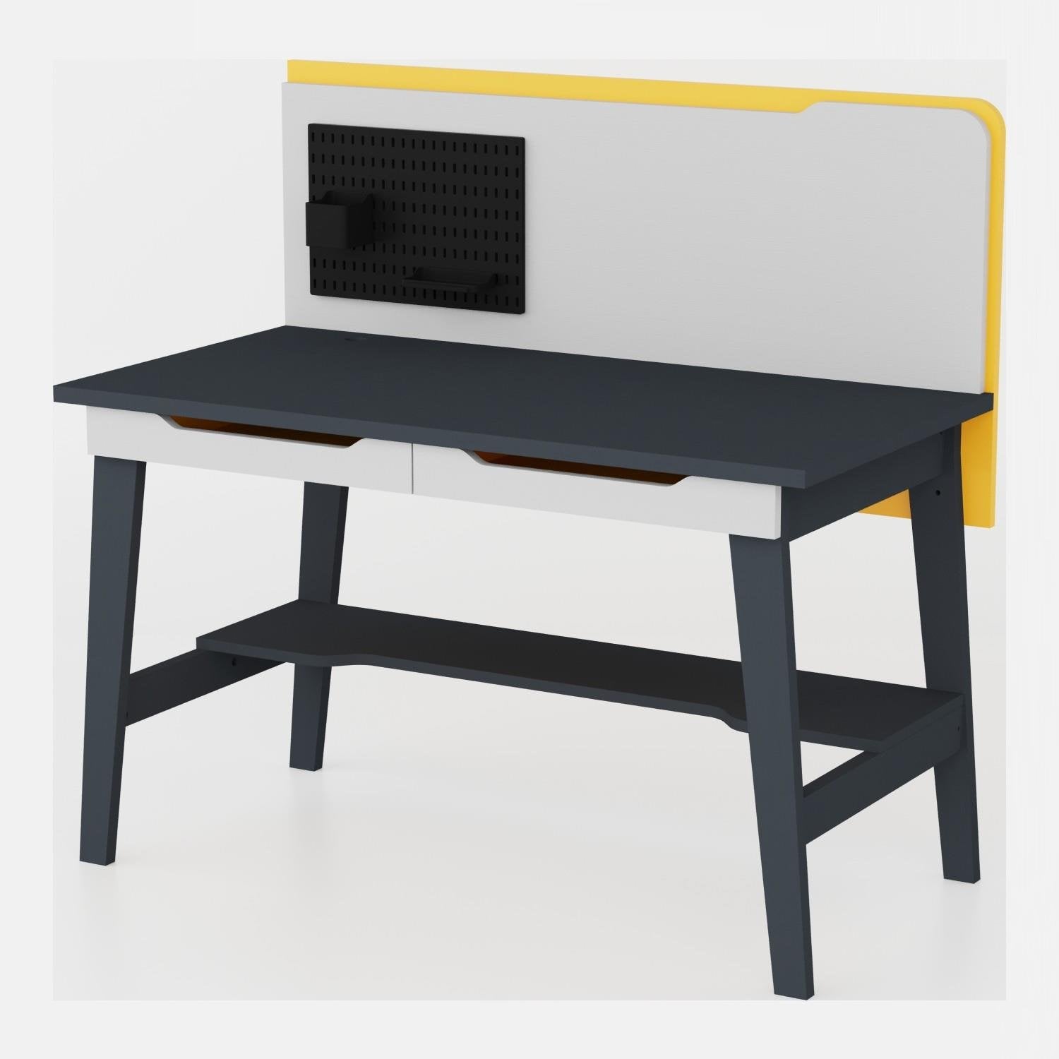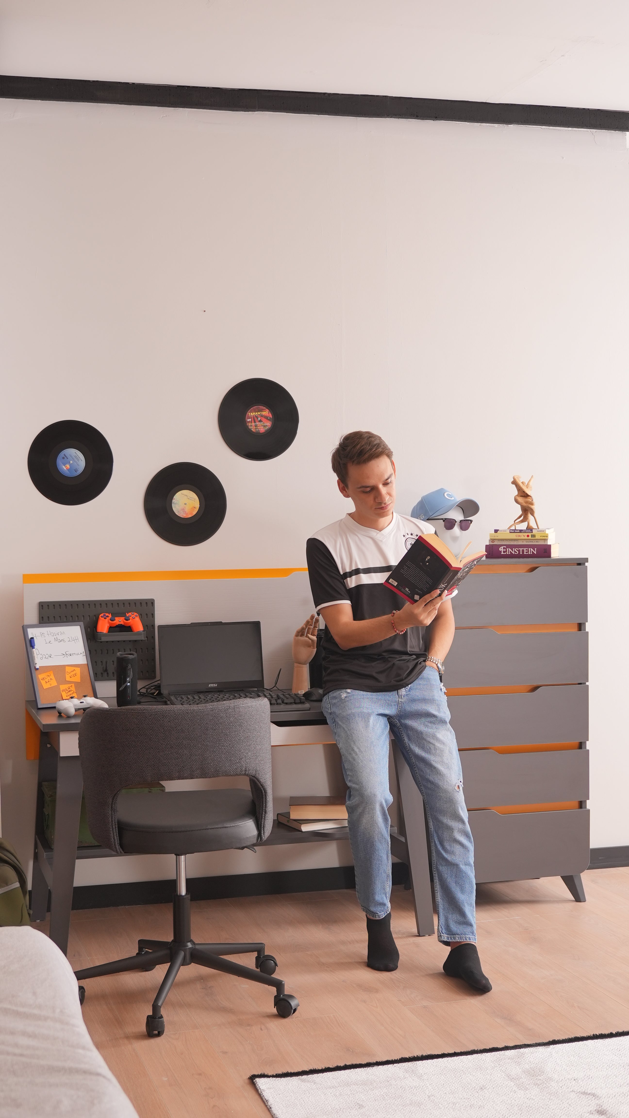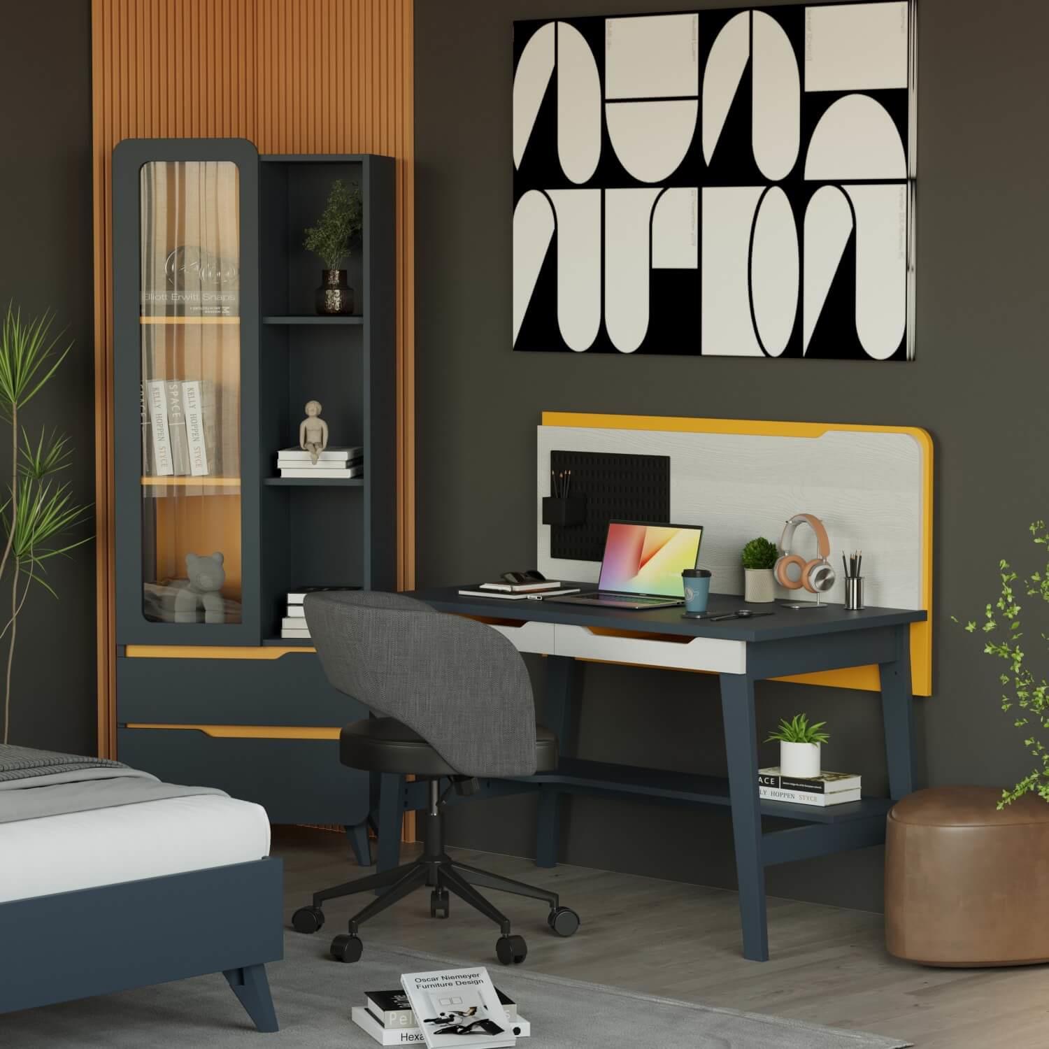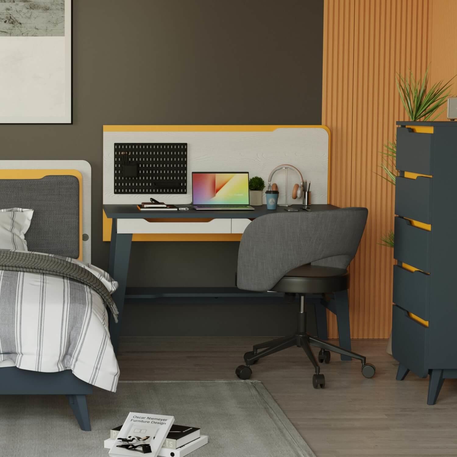 Çocuklar ve gençler için özel olarak tasarlanan bu fonksiyonel çalışma masası, hem estetik hem de kullanım kolaylığı sunar. Turuncu lake boyalı MDF bölümler ile canlı bir görünüm kazanırken, diğer kısımlar dayanıklı MDFLAM malzemeden üretilmiştir.